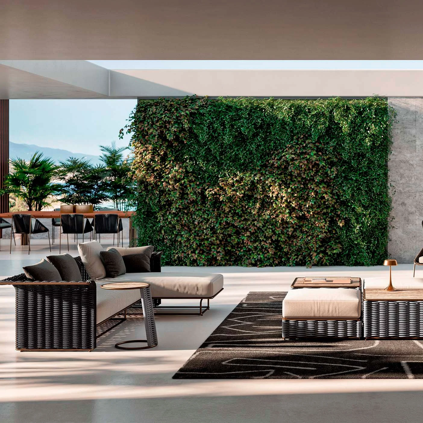 Creating outdoor spaces with charm and personality is our specialty as designers. Lighting, for example, is one of our key elements to create different atmospheres, such as an intimate and romantic atmosphere with candles, lanterns, garlands, or a more functional and practical space with wall lights. To add more life and freshness, natural plants are a wonderful option. But to have vibrant exteriors at all times, we love to use artificial plants, which are also amazing to change the scene according to the season or the occasion with ease.